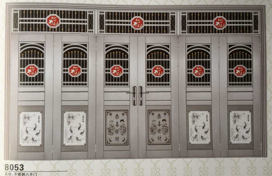 [门扇]:豪华304大框门扇。赞成双层中空玻璃或全不锈钢密封板。样式有:上下玻璃,上下玻璃和下密封板,全玻璃,全密封板等。您可以根据房舍的具体状况提出特别要求。