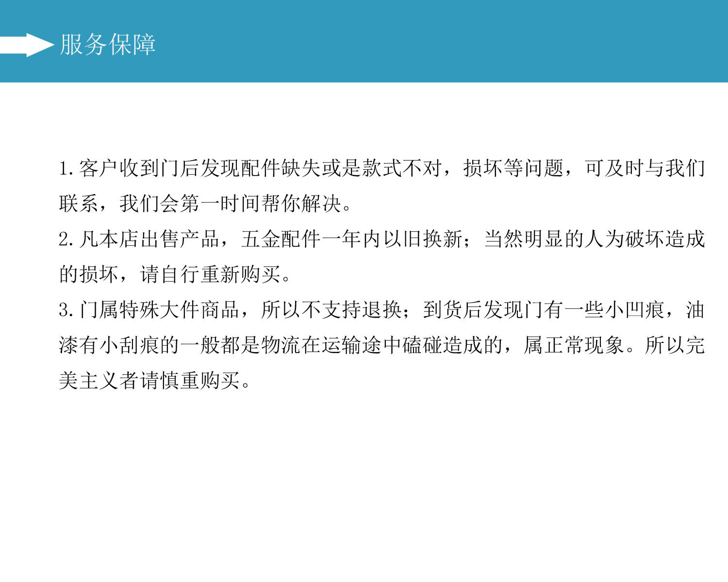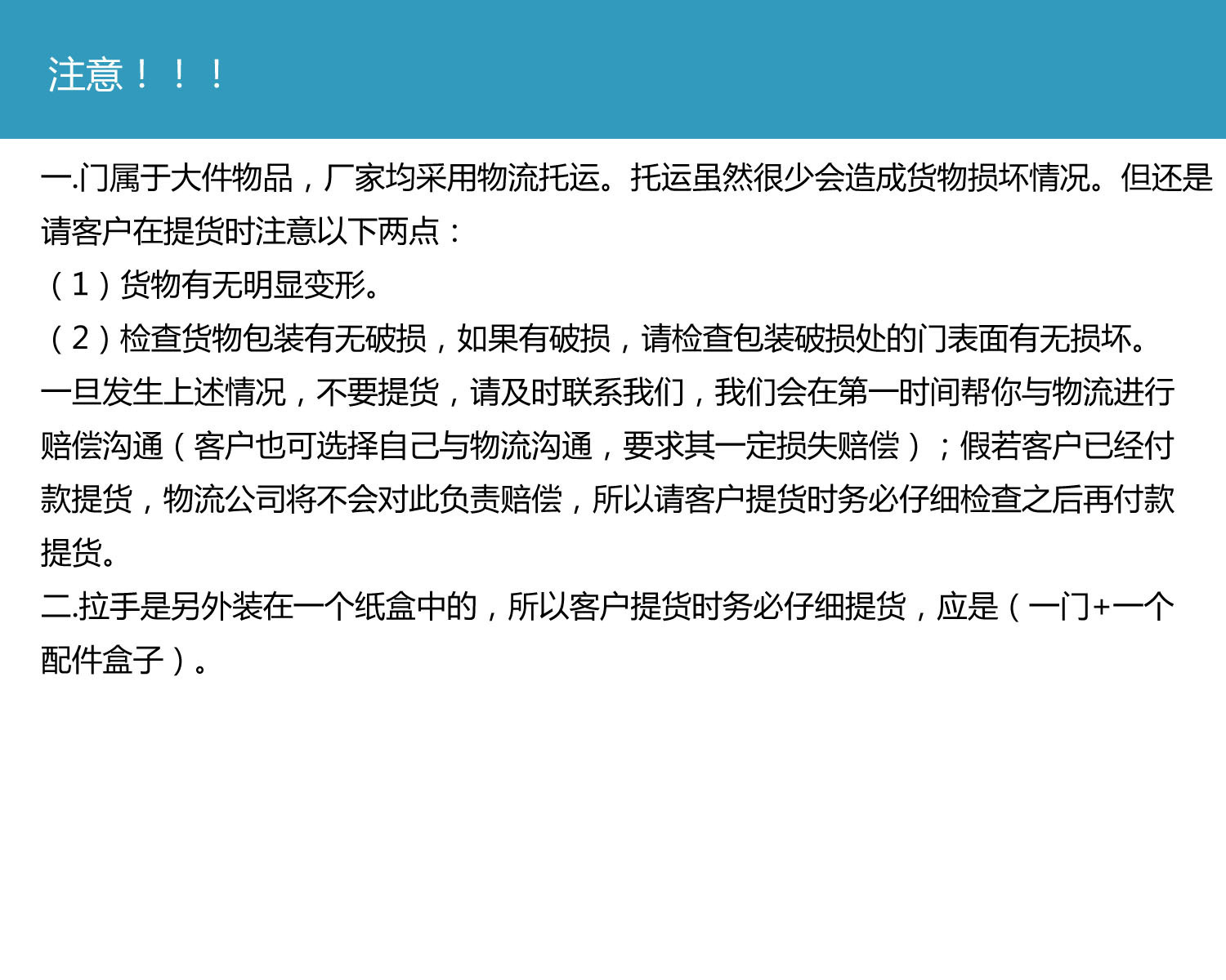 [非标定制]:如果您的规格是非常规尺寸,则需对其展开自定义。订购时间为在线付款后的15-20天。与您认定付款后,我们将下订单。下订单后,我们的系统将显示为交货状况。如果您在15天内从未接到货,您可以要求我们的客户服务为您延长交货时间。定制门的价钱以我们的采购员下达的订单为准。