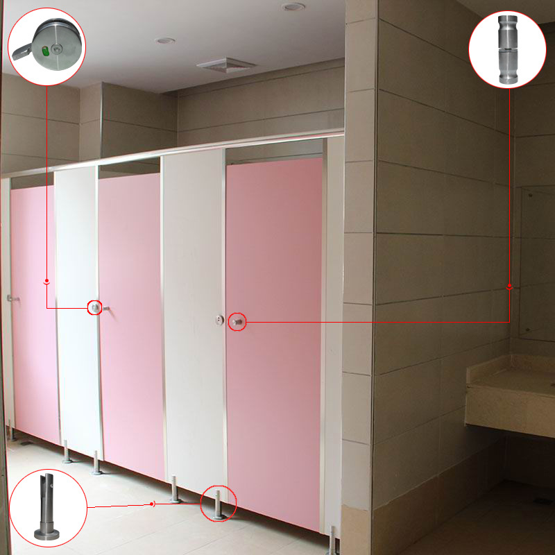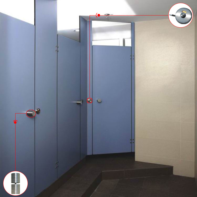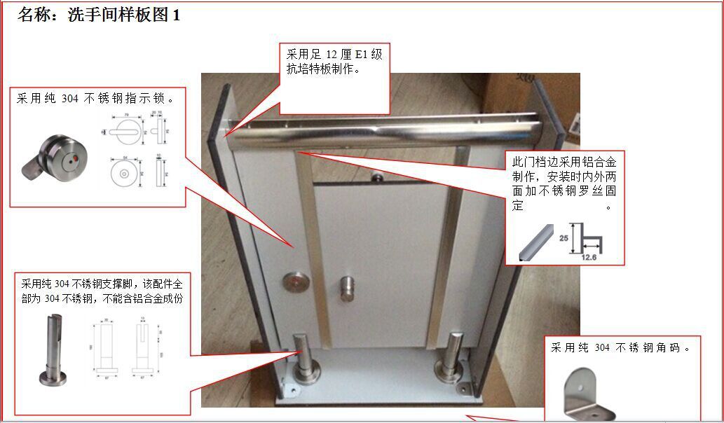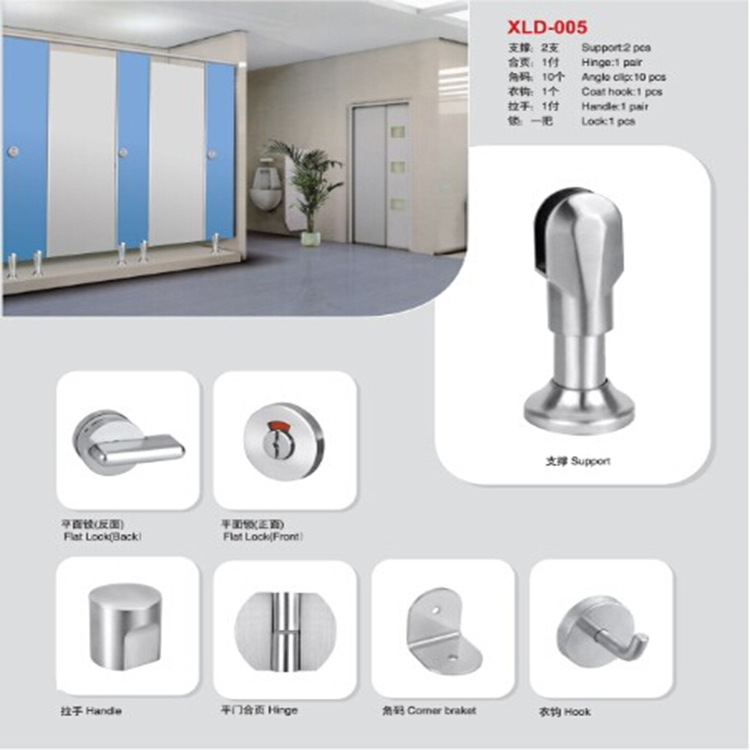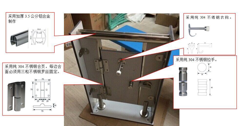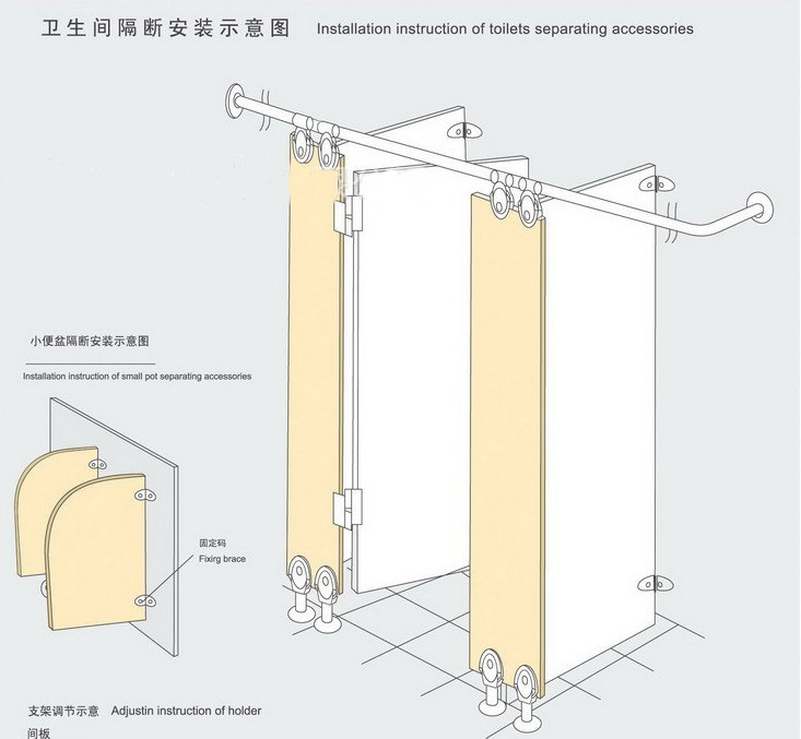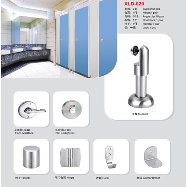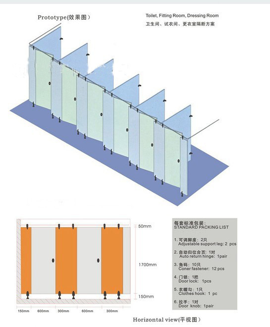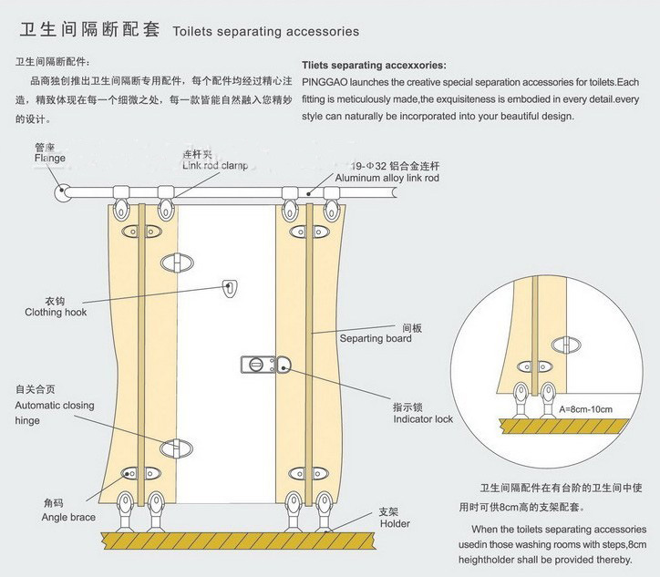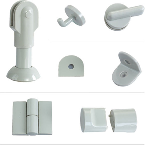 保健隔断的标准配件包括:锁,衣钩,一对把手,10个角,一对铰链和2个支撑脚