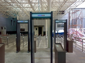 直通金属探测器,门中会确立电磁场,该设备可在人体携带金属物体时发出警报,并能准确检测人体或手提包中或携带物品的金属物体金属,例如各种金属制品,电子产品以及其他涵盖金属的物品等,是安全检查的有效性工具,可以有效性避免传统手工搜查致使的人权争端。