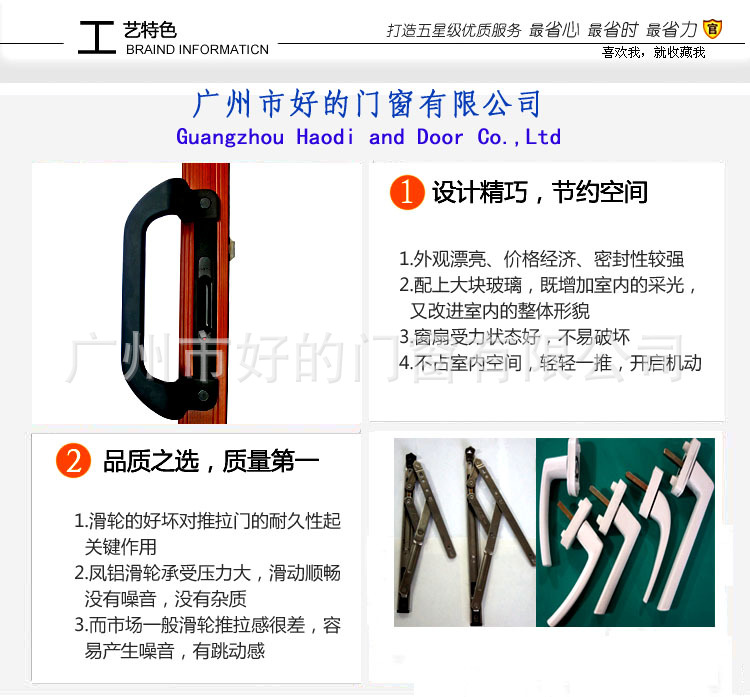 广州市好门窗有限公司是一家专业生产塑料钢门窗(UPVC),铝合金门窗的公司。公司拥有独立自主研发和生产各种产品的权利,并拥有自营进出口权。门窗。是海螺型材在广州市的唯一指定生产企业(第078号),也是广铝指定的铝合金门窗加工生产企业。同时引进德国进口威格玛机器,数控切割中心等先进的生产装置,拥有八门门窗生产线,技术力量丰厚,生产各种款式的高档塑钢,铝合金门窗,有圆弧,立弯圆弧平开,推拉,固定,抬起,向内打开,倒置,向内悬挂,用手打开窗子等