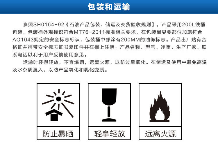 请参看SH0164-92“原油产品的包装,储存,运输和交付接受规范”,该产品使用200l铁桶包装,并且包装桶的外观相符MT76-2011标准的相关要求,并且包装桶的显著部分合乎AQ1043安全标志的要求,在包装桶的中部涂有200mm的油性装饰标记,产品贴有及格证书并含有安全标志证书的复本和桶上记号:产品称呼,型号,净重,制造商和联系对讲机,以简便用户反馈。运输过程中请小心翼翼轻放,不必在日光下爆炸,远离火源以防止过早氧化。避免高温以及在储存,运输和使用过程中的水杂质,以防止产品氧化和乳化变质。