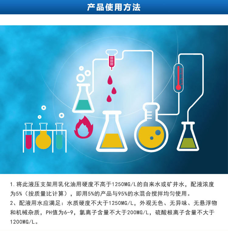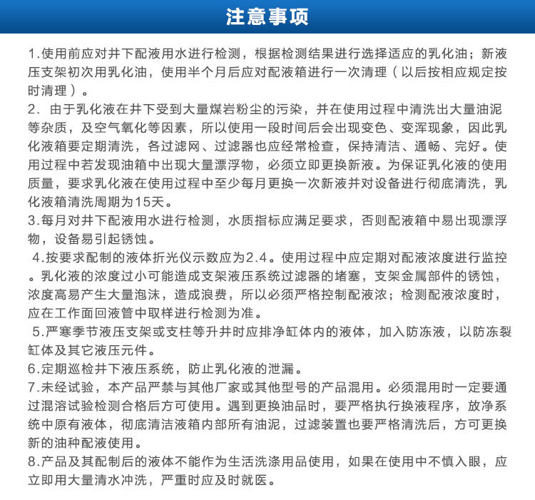 1.使用乳化油将硬度不超过1000mg/l的自来水或矿泉水用以此液压支架,其浓度为5%(按质量比测算),快要5%的产品与95%的混合水。均匀使用。