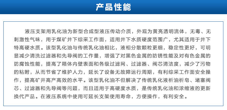 1.产品性能:乳化油液压支架是一种新型的合成液压传动介质,兼具黄亮透明的外观,无毒,无刺激性气味,用以综采地下采煤工作面,适用乳化油与传统的乳化油相比之下,兼具更细的液相分散颗粒和更好的稳定性,可大大缩减清洁工作量过滤器和先导阀,并加强黑色金属和有色金属的防锈性能。机柜的防腐蚀性能提高了箱内壁表面以及各级过滤器,过滤器和线轴的清洁度,缩减了尘土的粘附,从而节约了保护人力,延长了无故障操作周期设备,利于综合采掘。工作面的安全运行,提高了竖井的高产水准和效率。这种乳化油不仅化解了传统的乳化液析油析皂,阀芯堵塞,过滤器和导向设备的疑问。阀门,也适用于高硬度水质。它是传统乳化油和浓缩液的更新产品。在液压系统中使用可以延长支架的使用寿命,操作便利,有利安全。