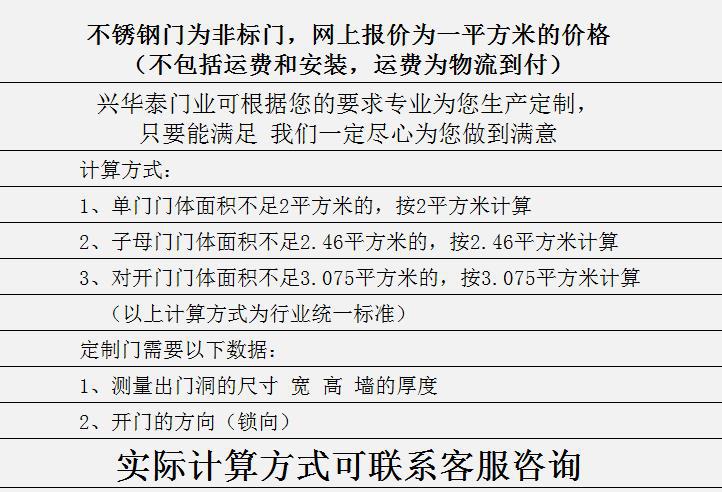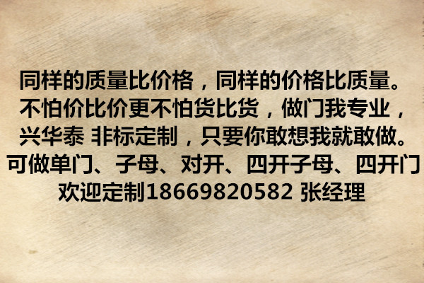 产品详情:兴华泰门业每天都会定量更新有关不锈钢门的原始信息内容。有关详尽信息,请登录兴华泰门业官方网站http://www.qdxinghuatai.cn以理解更多信息。您也可以直接去公司或致电公司展开咨询。详实的查询地址如下: