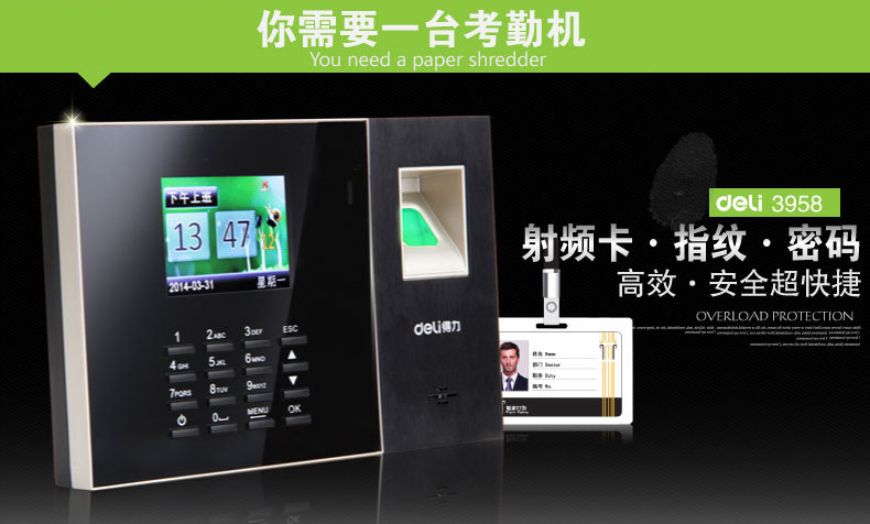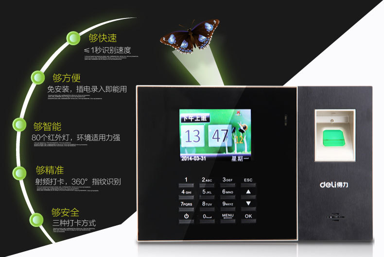 得力考勤机射频卡。指纹。密码是有效性的。安全超快