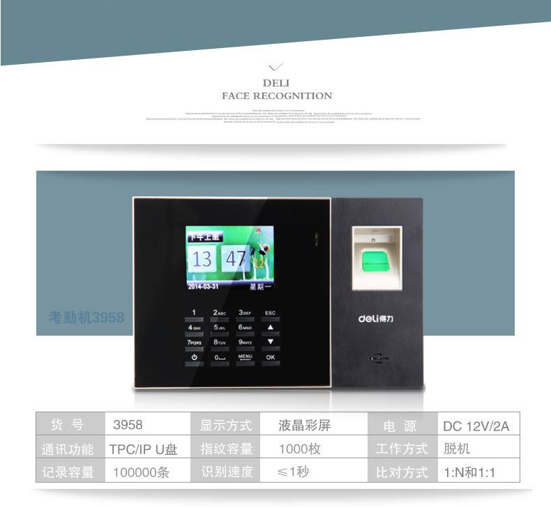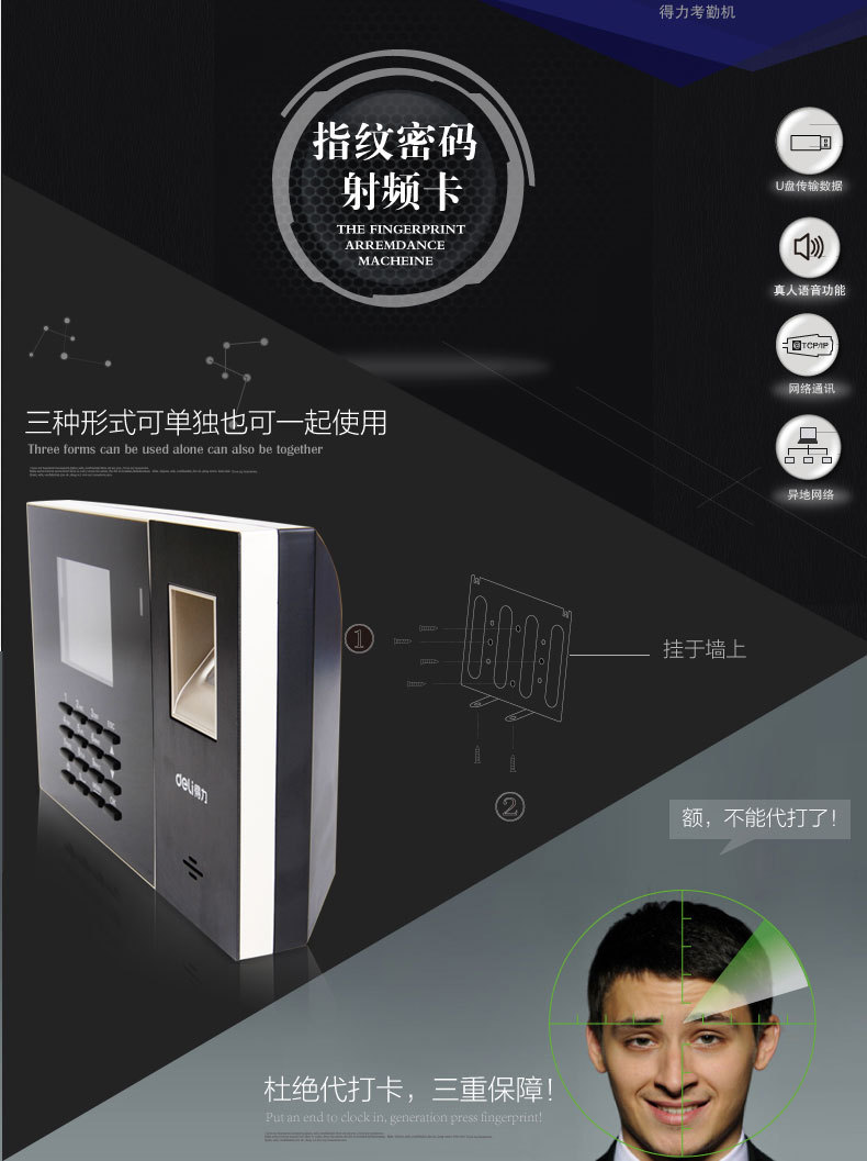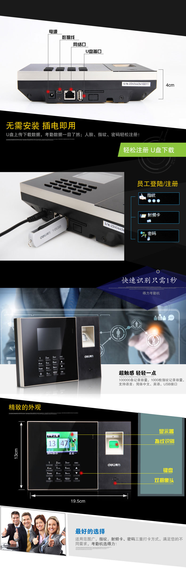 得力考勤机U盘传输数据;实时话音功用;网络通讯;扫除分代报到