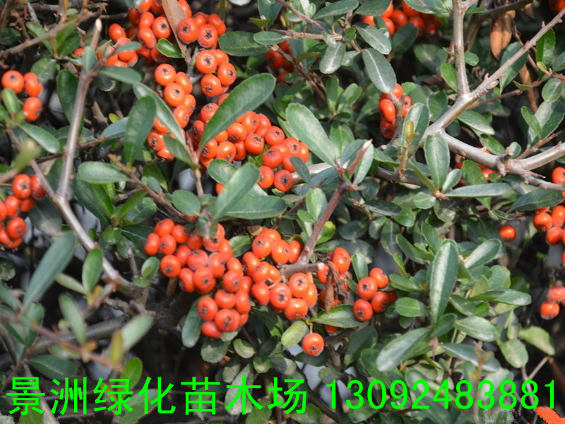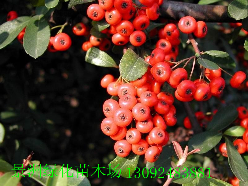 产品详情:火棘[1]常绿灌木,长4m。枝条短,先端有刺状,嫩枝上覆盖着锈色的短柔毛,老枝无毛。叶柄短,嫩时无毛或具柔毛;叶子倒卵形到长圆形倒卵形,长1.5-6厘米,宽0.5-2厘米,上端圆形或稍凹,有时具短尖的楔形基部,不延伸到叶柄,边沿锯齿状,在整个基部附近。双性恋,集生复伞房花序;叶柄长约1cm;萼片筒状;花萼5,三角形,先端钝。花瓣近圆形,白色;雄蕊20,花药黄色,花柱5,离生,密实的白色柔软的上子房毛。果实近球形,直径约5mm,橙红色或深红色。开花期从3月到5月。果期从8月到11月。