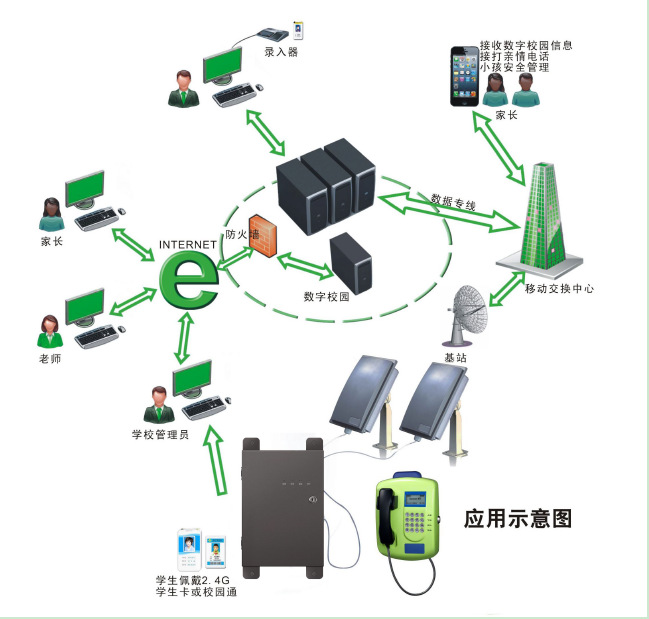 3.平安点到:学生配戴由我公司开发的2.4g卡或i宝贝并经过校门的指定区域,有关出入校门的相关信息可立刻发送到家长的手机上电话机;