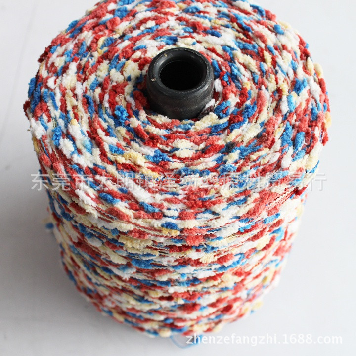6,雪尼尔线将程度装饰纱夹在芯线喑中。装饰纱的末端是松散的和长毛绒的。