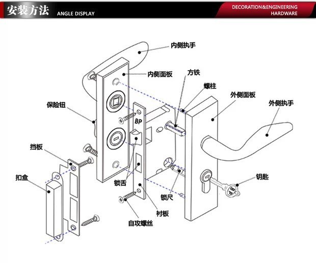 f.安装扣板和扣盒,指向锁体,使锁舌与锁舌平滑配合,并拧紧螺钉