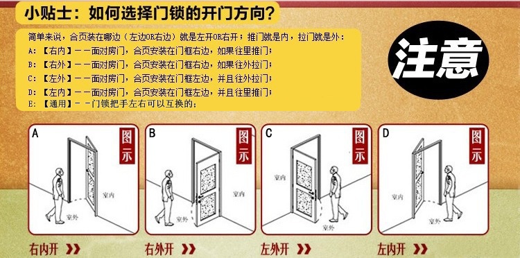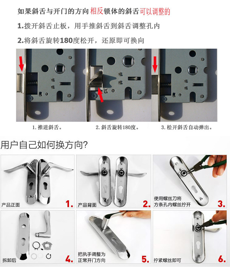 产品详情:答:请保证倾斜舌片的倾斜表面与关闭方向一致。当需调整锁体的打开方向时,打开斜舌换向片,将倾斜的舌头推入锁体,将其旋转180°,然后根据安装纸面图划一条线以打开孔。
