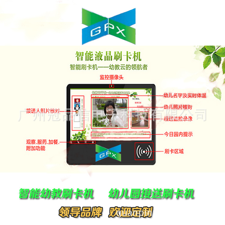 产品详情:这是目前中国最先进的幼儿园教育云平台接送管理系统。使用IPHONE平台的一体化构造设计,主机还具备防水防盗功能,外观精巧功能有力,集成了刷卡功能,照片验证功能,监控功能,温度测量功能,视频播放功能和手机短信功能合为一体,彻底改变了原本刷卡机的单刷卡功能,是幼儿园升级刷卡机的最新一代产品。