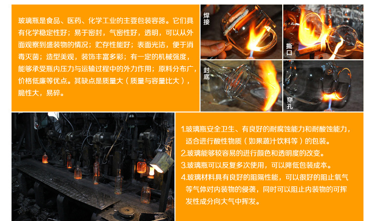 产品详情:徐州金顺玻璃制品有限公司是一家专业生产和加工玻璃瓶,玻璃杯,葡萄酒瓶,罐头瓶,饮料瓶,玻璃罐,酱菜瓶,果茶瓶等的公司。它具完整的科学质量管理体系。徐州金顺玻璃制品有限公司的诚信,实力和产品质量取得业界的认可。欢迎各界朋友光临,指导和接洽业务。