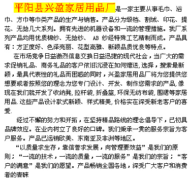 4.为什么说竹纤维毛巾不会变色或致密?使用一段时间后,棉毛巾会变黑,变色且变硬。这是因为棉纤维中富含目前无法清除的植物蛋白,这些物质与人体皮肤分泌的油和盐,毛巾上的细菌分泌物以及钙和镁离子触及后它们在水中会时有发生化学变化,并产生新物质并吸附在毛巾上。使用时间越长,这种现象就越严重。竹纤维经过彻底的脱脂,脱糖和脱蛋白处置,以防这些物质在竹纤维毛巾上产生化学反应,因此,无论使用多长时间,竹纤维毛巾都不会变色,变硬或变硬,并且一直维持柔软,新鲜和亮。