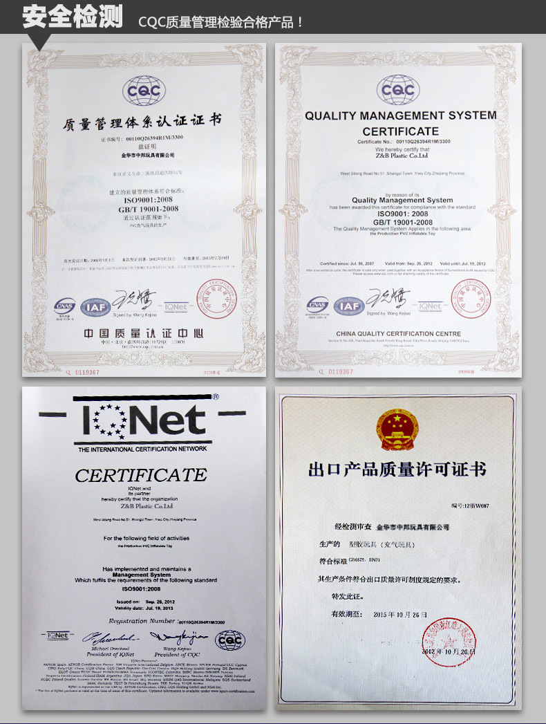 金华市中邦玩具有限公司是一家集生产,研发和销售于一体的企业。它主要致力于生产充气孩童玩具,充气促销礼物,婴儿游泳池,充气房舍和户外休闲必需品。出售欧美国家。获取PVC并通过CE认证,EN71玩具安全检测. 中邦自成立以来,它始终本着“诚信为本,共赢共享”的理念致力于提供高质量的产品和关怀服务,并与分销商与在线店铺开拓更开阔的商贸世上!