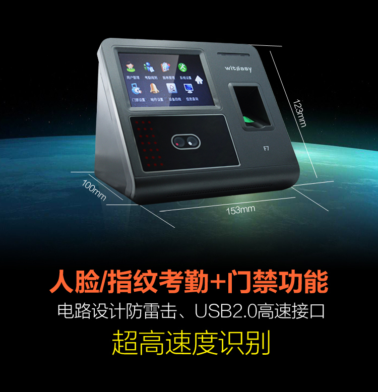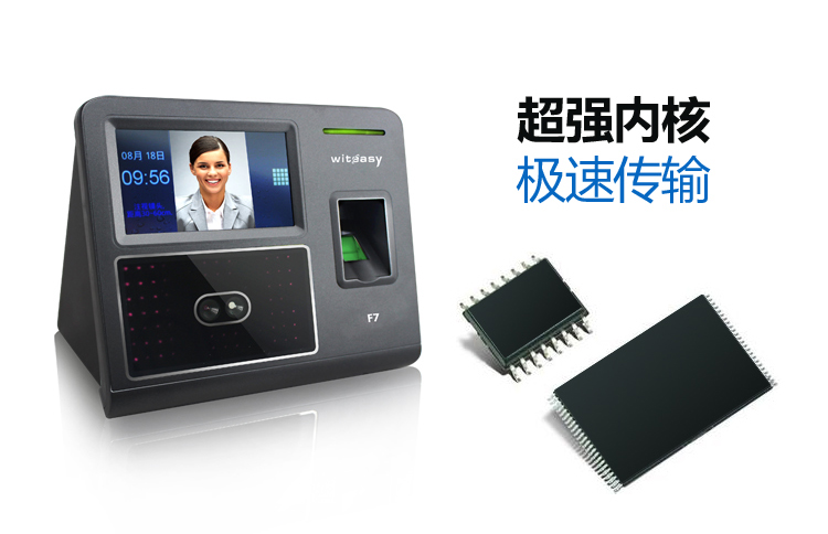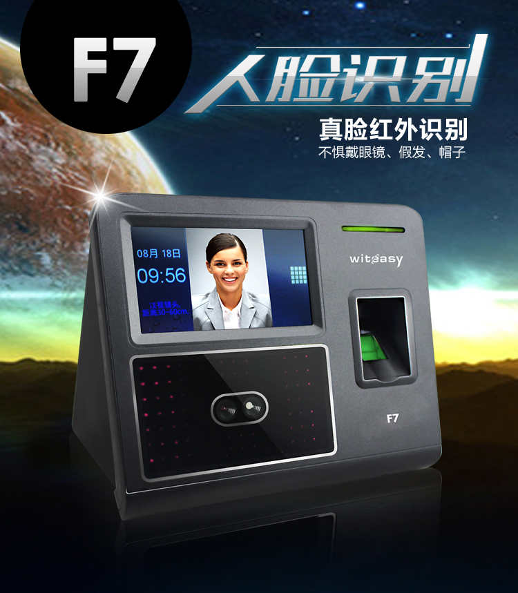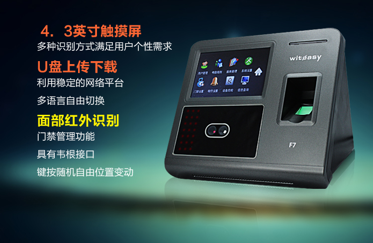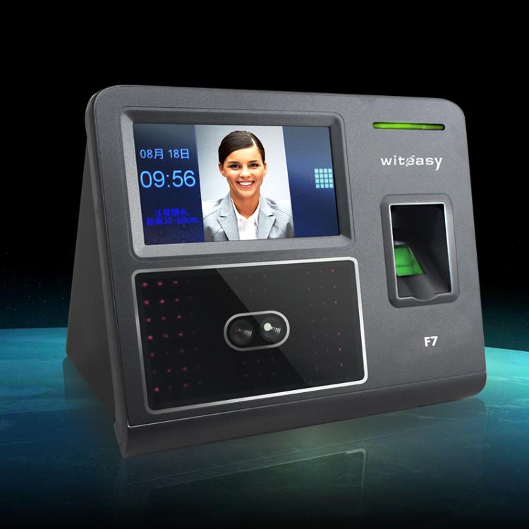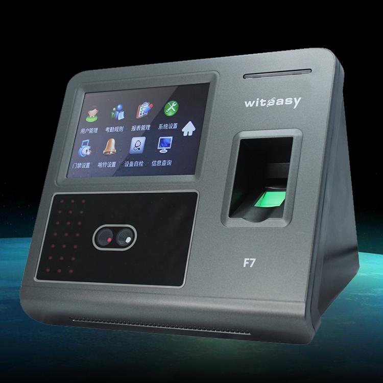 F-7人脸,指纹识别考勤机,u盘直接导出报告,网络通讯支持门禁功能4.3寸触摸屏