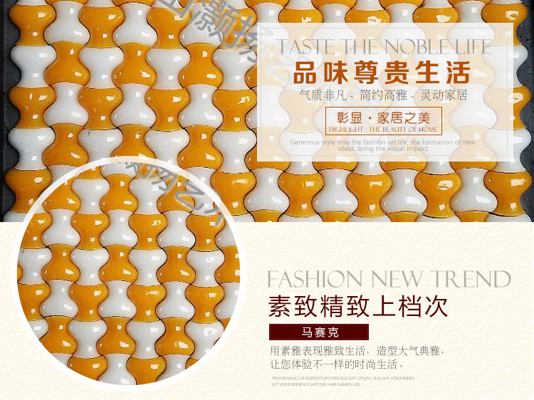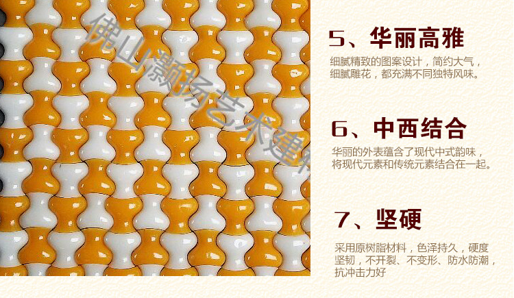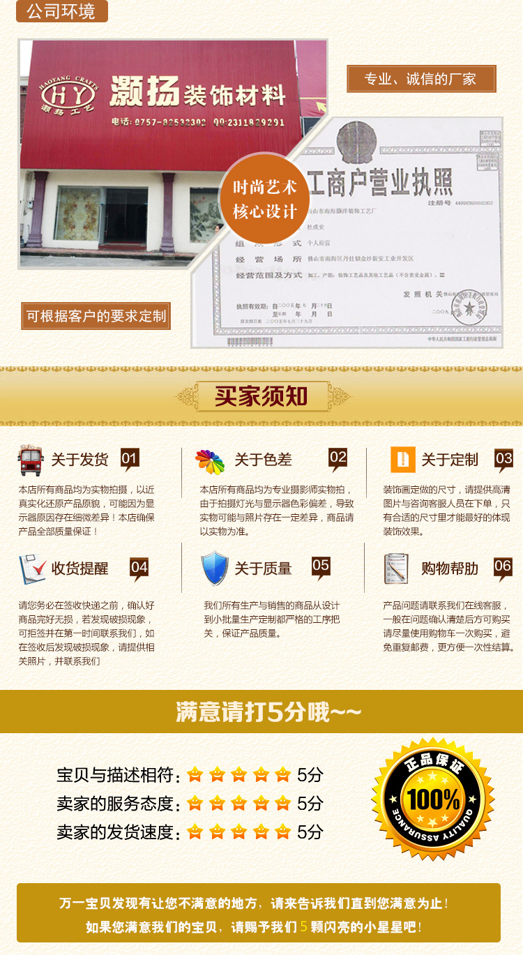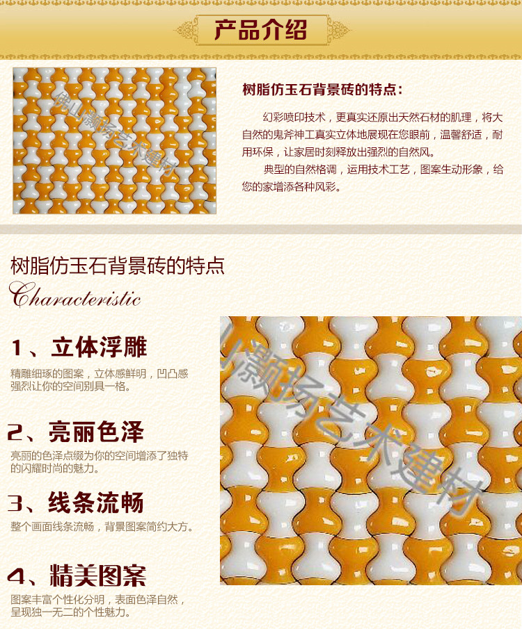 产品详情:广东省佛山市灏洋装饰工艺有限公司成立于2003年,座落全世界各地陶都之城-佛山,是一家集建筑物装饰材质研发,生产和销售为一体的综合性企业。主要产品有:瓷砖彩雕艺术背景砖,3D电视背景砖,大理石线门套线,树脂艺术背景墙,仿玉石背景砖,树脂腰线,马赛克,喷墨腰线,艺术实木复合地板等装饰配套产品。普遍用以构筑物地面及墙体的装饰,适用应用于各种尺寸的空间,例如住宅,博物馆,酒吧,娱乐场所等,以加强空间的美感并实现生活与艺术的美妙结合。