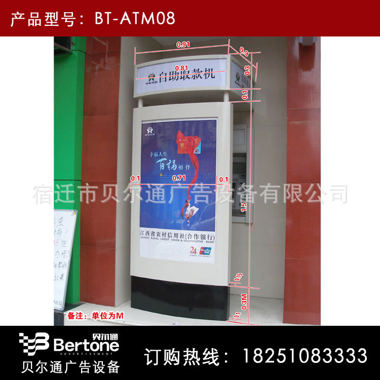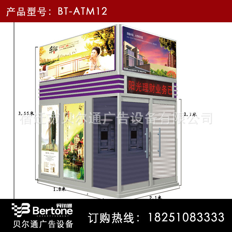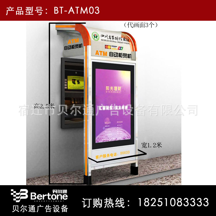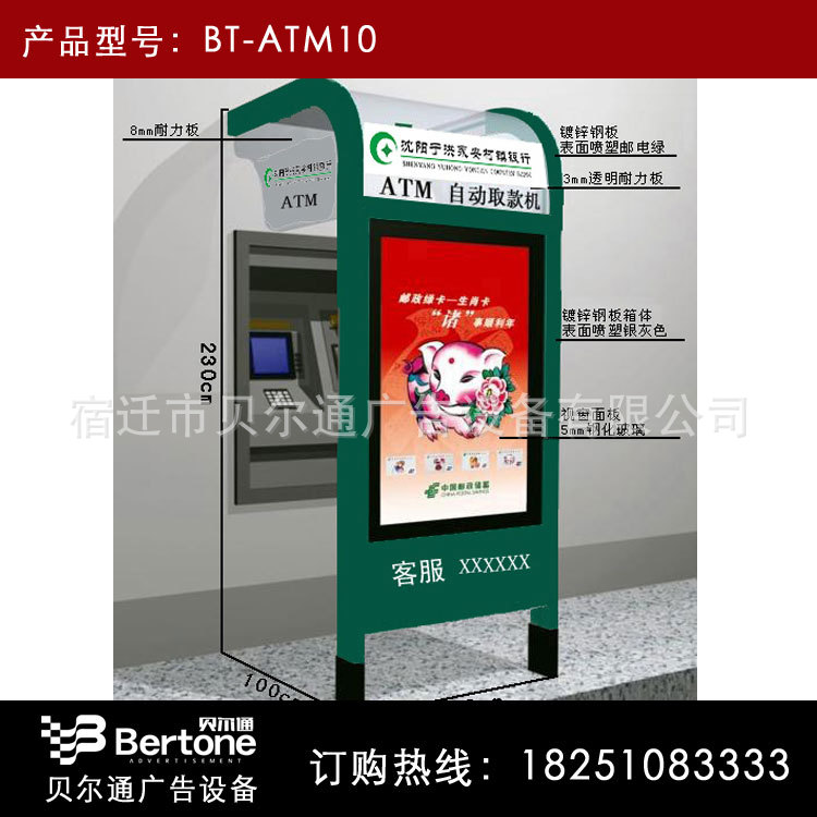 ATM自动柜员机防护罩功用:ATM自动柜员机防护罩滚动灯箱可编程操纵,既可以当作银行自己的广告传媒,又可以公布到外界,是为了美化城市,提升银行形象;自动柜员机保护罩的形状很漂亮,有曲直面组合;多向曲折表面等;单色或两种颜色分布,可根据不同库的规格颜色展开控制;自动柜员机防护罩的材质主要是镀锌冷板,辅以压克力板件,不锈钢结构件。防撞,损坏,尘土,雨淋,日晒,影子。