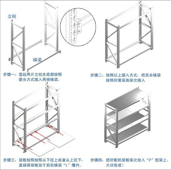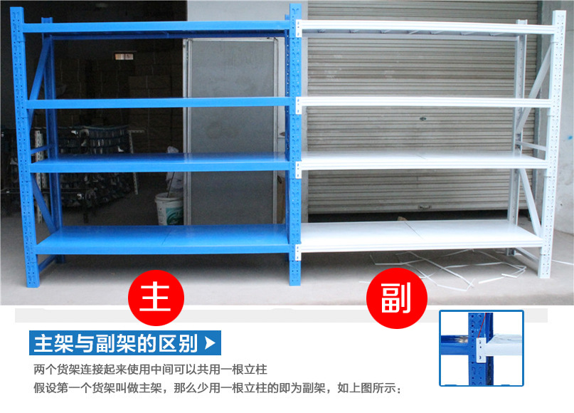 [主搁板和辅助搁板的描述]:搁板由立柱,横梁和层压板组装而成。一个单独的有两个立柱。这种架子称之为主架子。如果您将几个架子组装成一排,除了第一个架子需要两根立柱,其他架子可以与前面的一块共享。这样的架子称之为子架,这样可以节约空间并减低成本,如果是需要频繁移动的架子,提议使用主架子,联接主架子和子架子的架子须要随主架子一齐移动。架子。