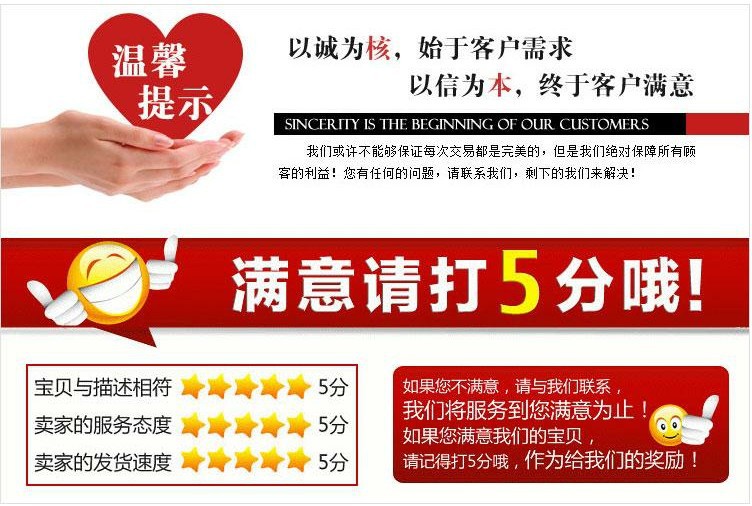 5.如果在客户评估之前有任何不满意之处,请在客户评估之前与我们联系。在客户的权益范围内,我们将使客户满意,直至满意为止,并且我们公司将不接受任何直接或负面评价。