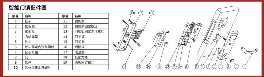 1.打开包装盒后,首先检验门锁构件是否完备,方向是否与屋子方向一致,然后使用电池测试电脑锁芯和电路板是否工作正常,然后开始安装门锁:智能门锁的主要组成及安装过程如图所示;请按数字依次安装门锁(有关组件的称谓,请参见表5)。