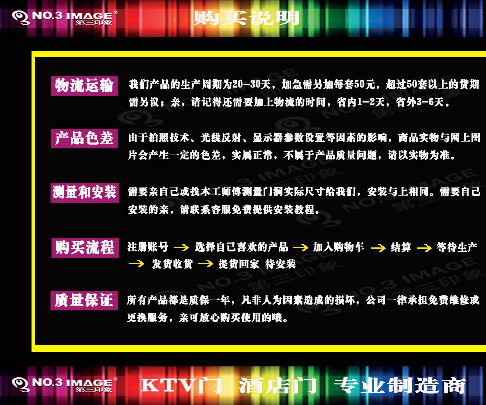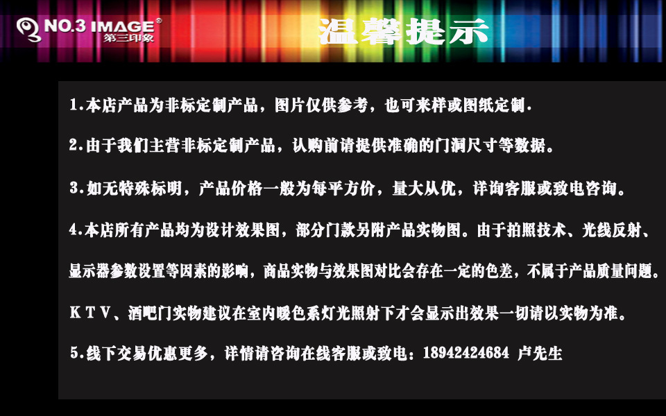 本店所有产品图片均为设计效果图,部分型号附带实物图片,由于摄像技术,光反射,显示参数设置等因素的影响,实际产品与实物之间会有一定的色差渲染,这是正常现象,而不是产品质量问题。提议用到ktv和酒馆门在暖和的室内照明下显示效用。请以实际产品为准。