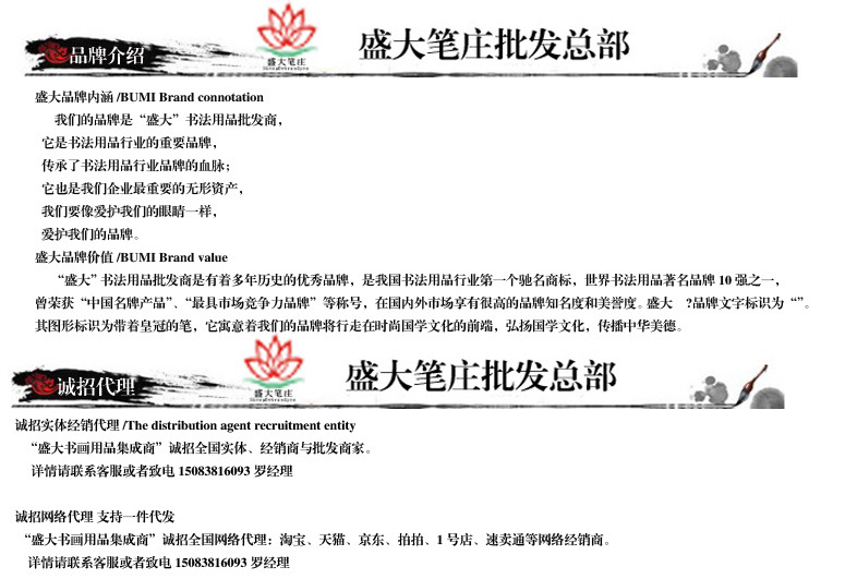 “盛大字画必需品批发总商”的产品全部由盛大文化用品有限公司生产,某些代理产品也将按照公司的质量管理体系展开检查和运输;