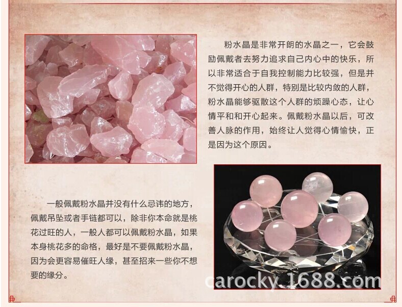 粉红水晶:一种可以发展心脏脉轮,促进感情发展,帮助追求爱情,把握爱情和享用爱情的宝石,是服务行业中改善人际联系,增加知名度和吸引业务的最佳兵器机遇。可以帮助您透彻心里并发现自我健全。