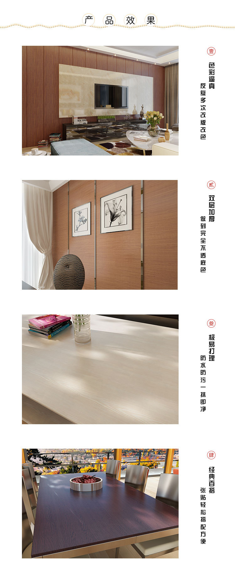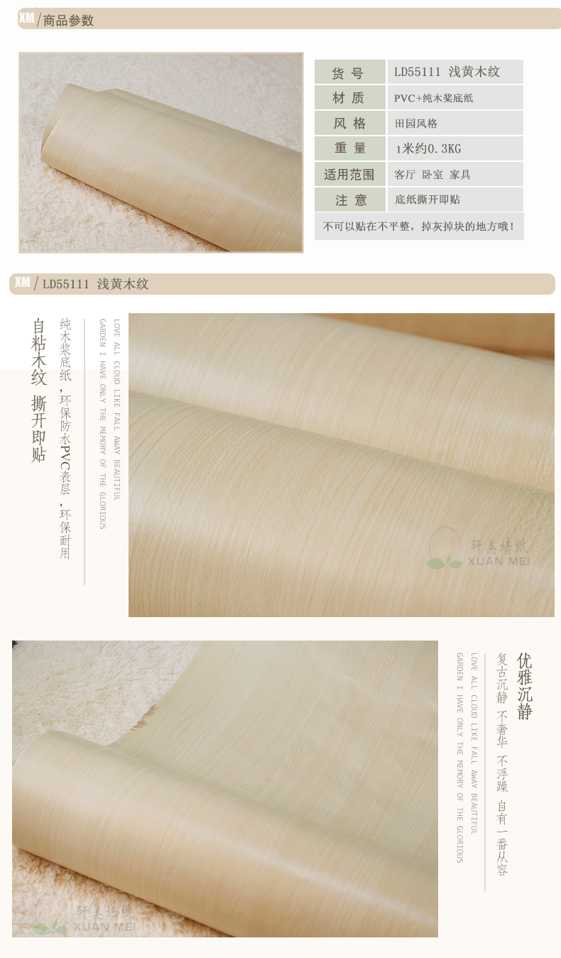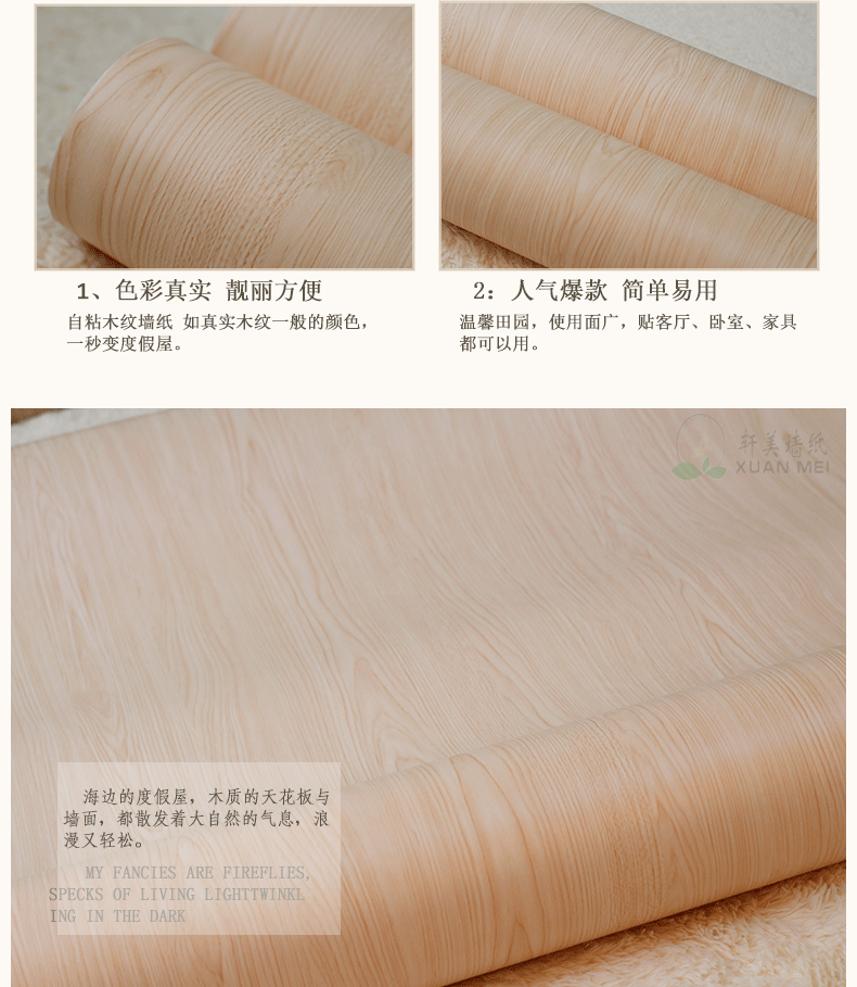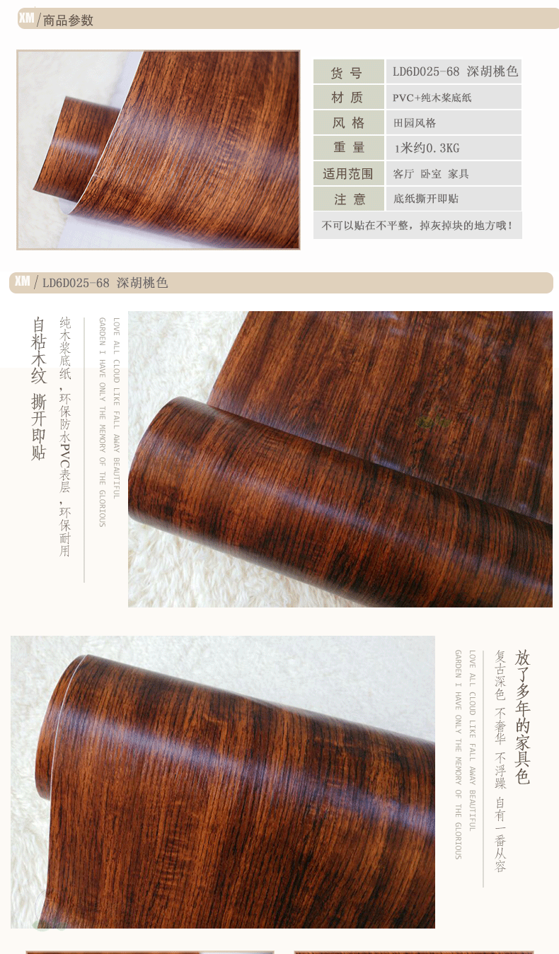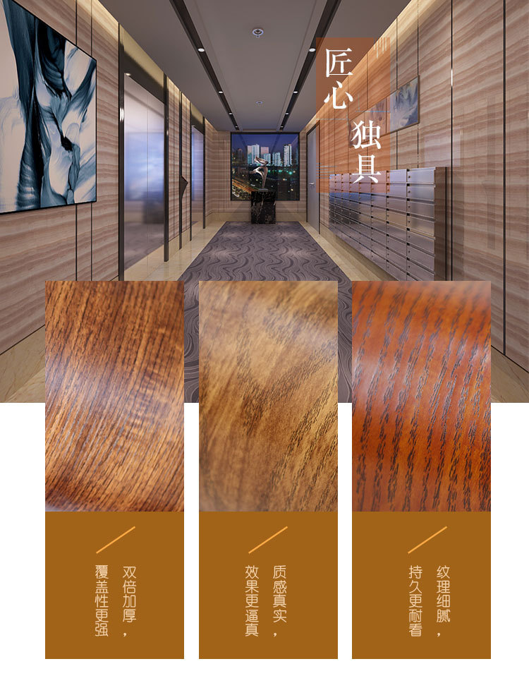 以上多种木纹样式可根据需在正面和背面涂自粘和热熔胶。这种胶在涂完后是干燥的,加热后可以溶化,具很强的可塑性。
