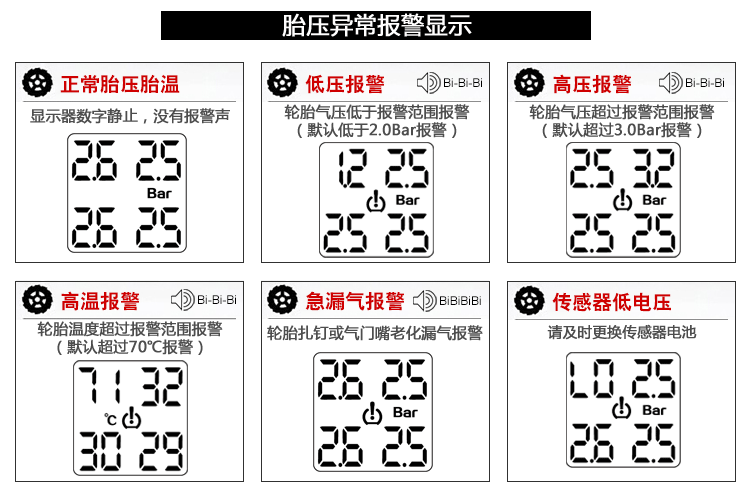 4.当轮胎压力和温度超过规格设定值时,蜂鸣器报警。