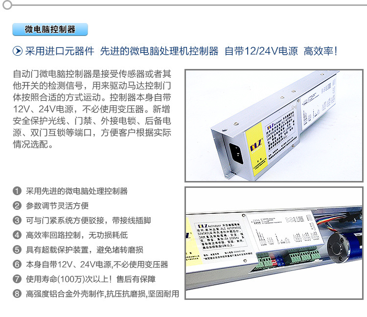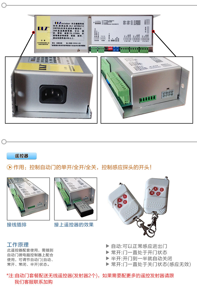 产品详情:自动门人体检测部分使用家电遥控发射和接收技术,不受环境光的影响,自动门控制器是智能多功能手动无线遥控两用电动门控制器。以下是自动门控制器的安装和使用说明的详尽说明。