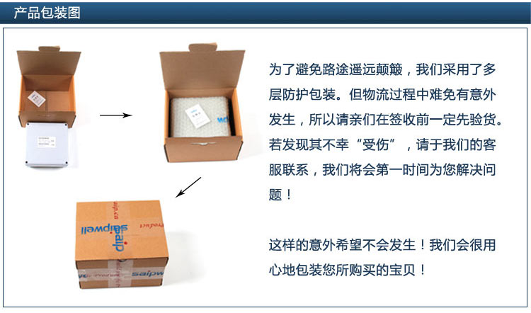 收到普通物流时,请在物流运输站现场检查并接纳,如果货物紧缺,货物不正确或运输途中货物损坏,请当场关联我们并提供座机电话当地物流公司的号码和主任的人名。如果确定货物并未被人为损坏,则所有往返费用和其他费用均由我们承担。