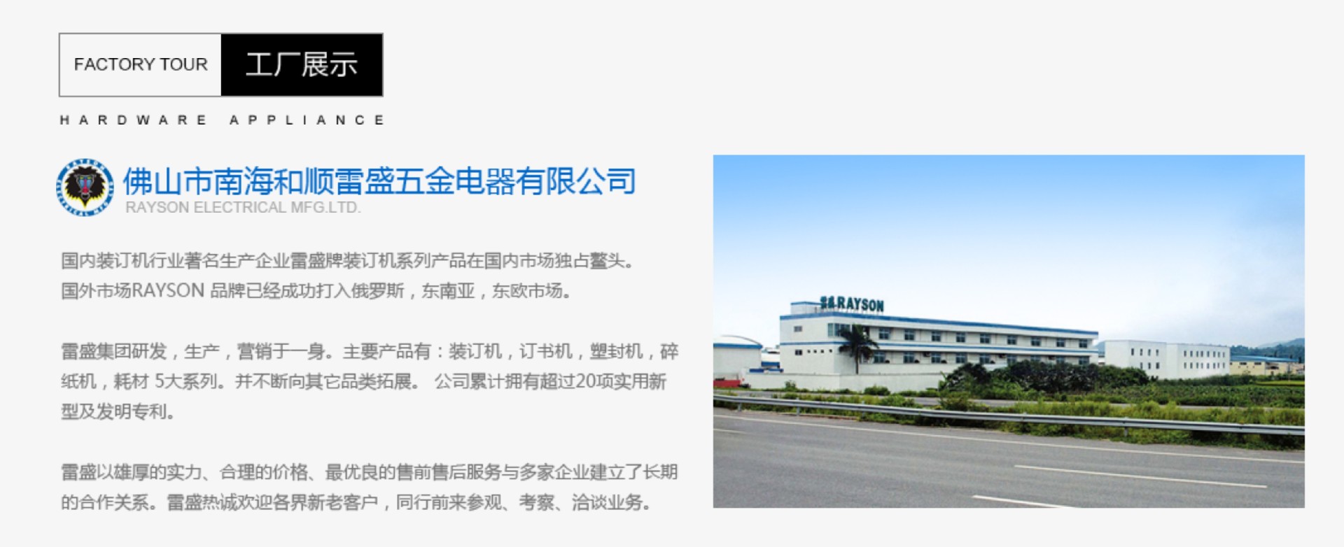 产品详情:佛山市南海和顺雷盛五金电器有限公司是国内装订机行业的广为人知制造商,雷盛牌装订机系列产品在国内市场处于领先地位。国外市场RAYSON品牌已成功进入俄罗斯,东南亚,东欧市场。