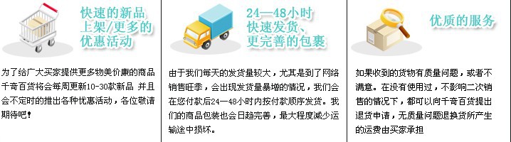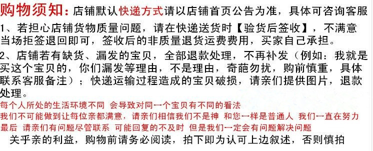 7.售后服务是公司最基本的服务。我们希望为大家提供不错的售后服务。同时,不错的售后服务还需要客户的配合。在退货或更换商品之前,请细心阅读以上解释,并尽量严守公司的上述规定。,以免影响您的售后服务。