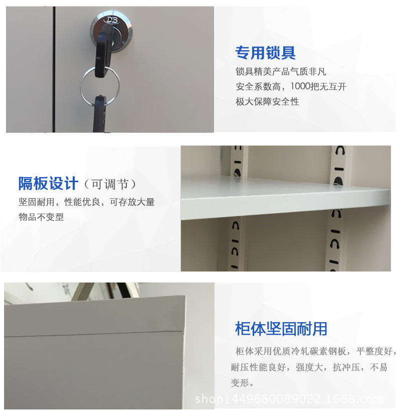 文件柜材质:1.选取厚度为0.6mm的日本import冷轧钢板和镀锌钢(裸钢的厚度为0.6mm,喷涂后可达0.7mm-0.8mm);2.镀锌钢不需要酸洗和磷化学和防锈处理;3.柜体表面喷有新西兰import混合型热固性粉沫,耐高温,防静电文件柜特征:1.滑动门早已过多次测试,以保证开关平顺。上下装备滑轨;2.设计用以拆装,便于运输和存放;3.专业防盗锁是标准化配备;4.机柜的内部搁板可以安放在规范A4file文件夹中,并且该搁板可以悬挂在A4文件夹下面;5,柜内层高度可根据要求自由调节;6.机柜底部有一个水准调节设备,以提高安全性和稳定性。7。可以采用各种句柄,锁和代码锁。8.直文件柜提供极大的存储容量;9.形状细致光滑,构造可靠稳固;