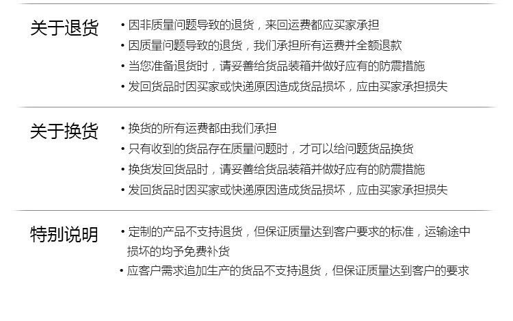 本店寄来的货物完好无损。接到货物时,须要当场检验货物,以认定货物的基准,型号,质量和数目是不是一致。,请回绝在清单上签字或要求承运人在证书上签字(损坏的数目和程度,承运人的签名或盖章等),并遵循发票上的电话号码。我关系。如果从未承运人的验证,将不接纳赔偿。多谢您的配合!