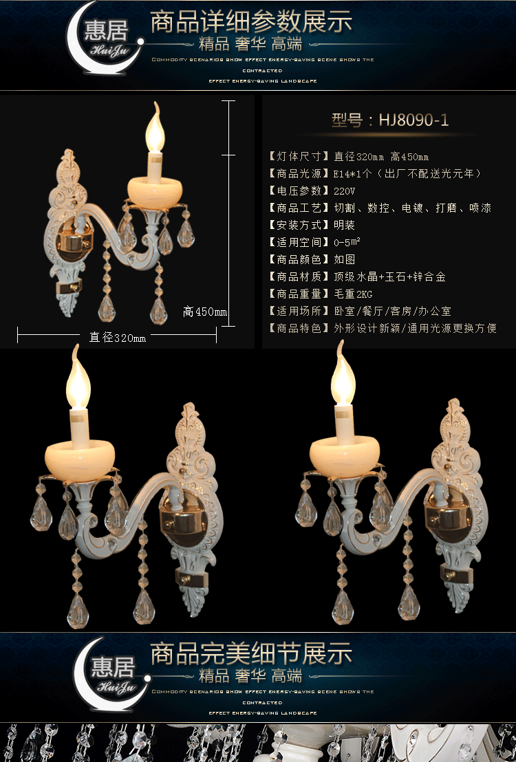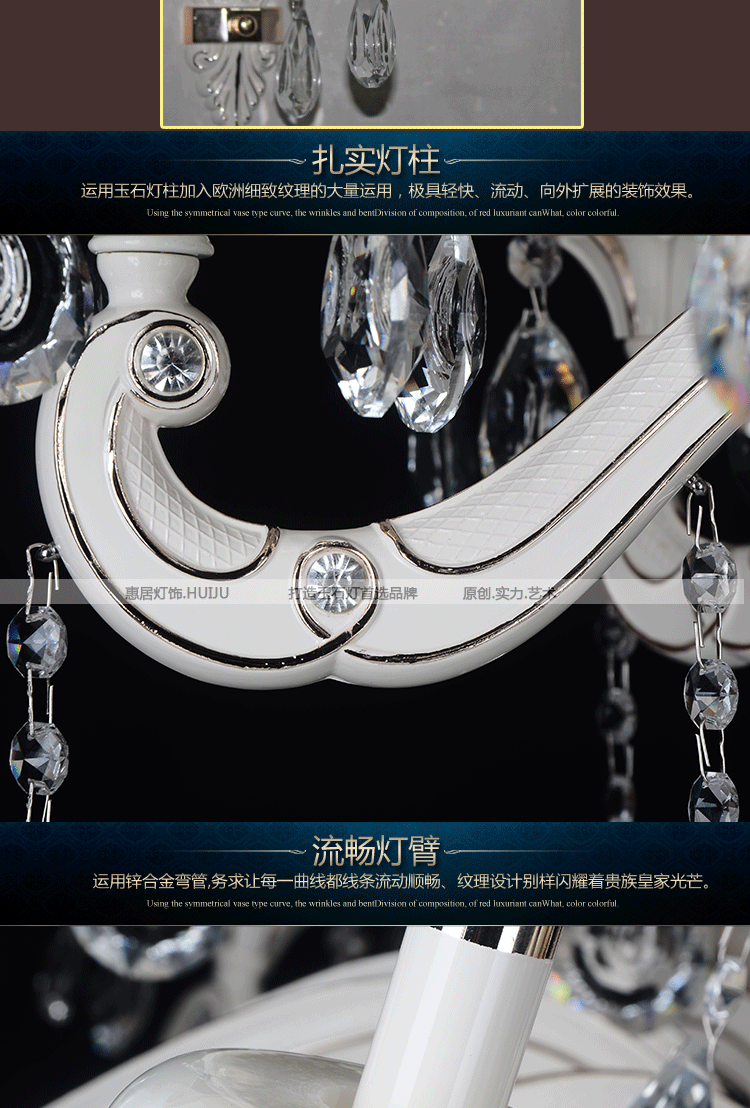 产品详情:汇聚照明·产品特点:[水晶球]选用100%高品质的水晶,闪闪发亮,现代时尚。[水晶配件]选择优质的圆形搭扣,花形别针,箭头形搭扣,针,螺丝和甜瓜链;[制造技术]每年十把剑,八年的风雨都达到了终极水晶灯的生产工艺;[风焊]焊接接头外观美观,光滑,无气孔,绝对行业遥遥领先;[打磨抛光]进口砂光打磨,最合适的打蜡量,有3年经验的匠人护送;[水晶色]24K金电渡,不变色,不生锈,颜色鲜艳,华贵高尚;[水晶等级]国内有半手工,手工,仿进口,进口水晶,可根据要求选择不同等级的水晶。