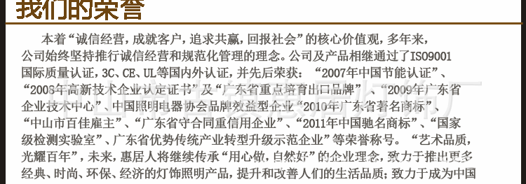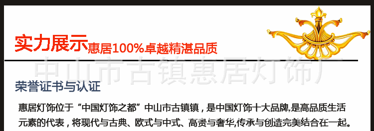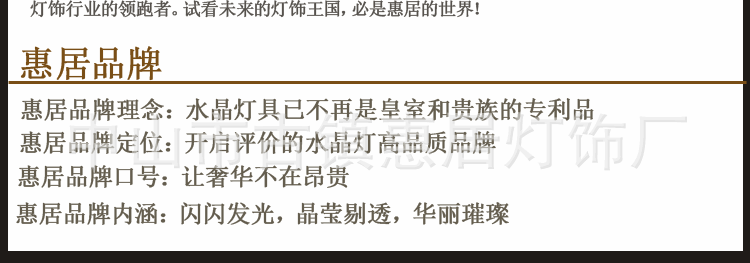 [营销优势]我们不需要昂贵的商店,我们只需展示厅;我们比批发分销更轻,我们比直销更重要。[经验优势]十年(水晶灯工程高端照明经验),一百年(专注于水晶灯照明)追求相同[声誉优势]中国名牌产品,中国云石灯十大品牌,中国水晶灯广为人知品牌