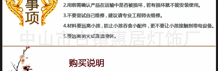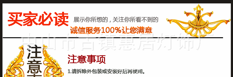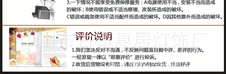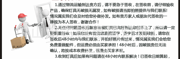 4.接到货后,切记绝不急切签署!签收前一定要在送货人员面前检查货物!首先要检查包装是否完整,外箱是否变形,是否有挖坑孔,检查运输单上的件数是否匹配,是否有任何拆卸印痕,如果有,请回绝并立即通报卖家!5。本店所有灯具严苛按照欧美的原始设计风格生产,所有产品出口到欧美国家。我们所有产品均严苛按照欧州@的基准生产。nz@和美国CE,并通过了欧州UL和美国CE的及格产品。