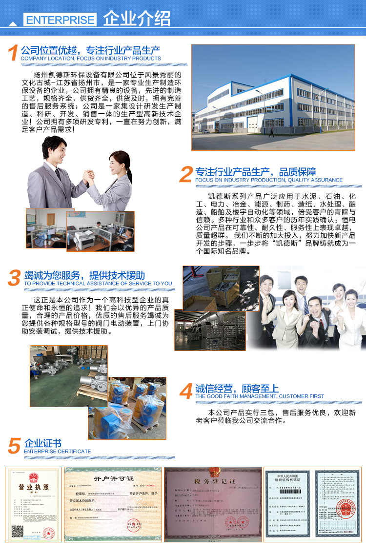 产品详情:扬州凯德斯环保设备有限公司座落我国历史文化名城-扬州,是一家致力于电动阀研发,生产,销售,工程设计,安装调试和技术跟踪服务的高技术企业。@。
