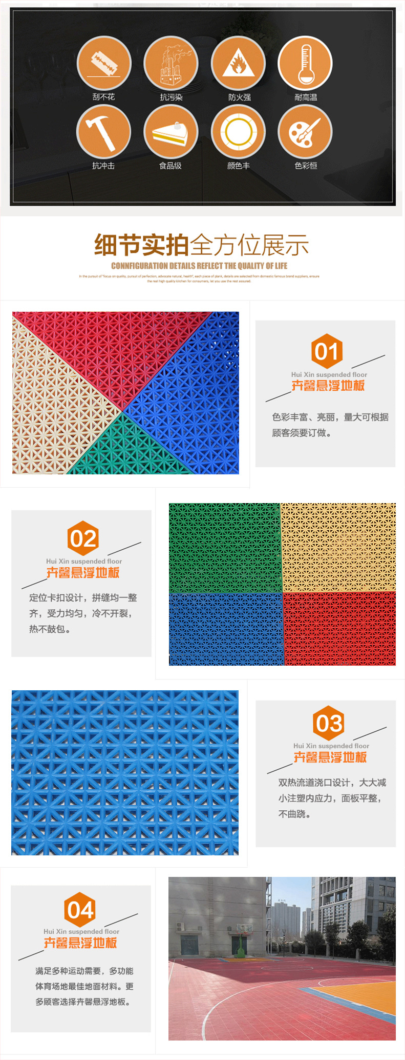 4.户外使用率高:由于产品的基本结构为m形格子结构,地板底部有洗手池,因此整洁地板或雨后无积水,确保运动场的利用率。