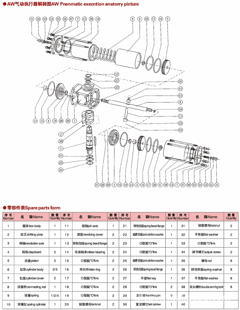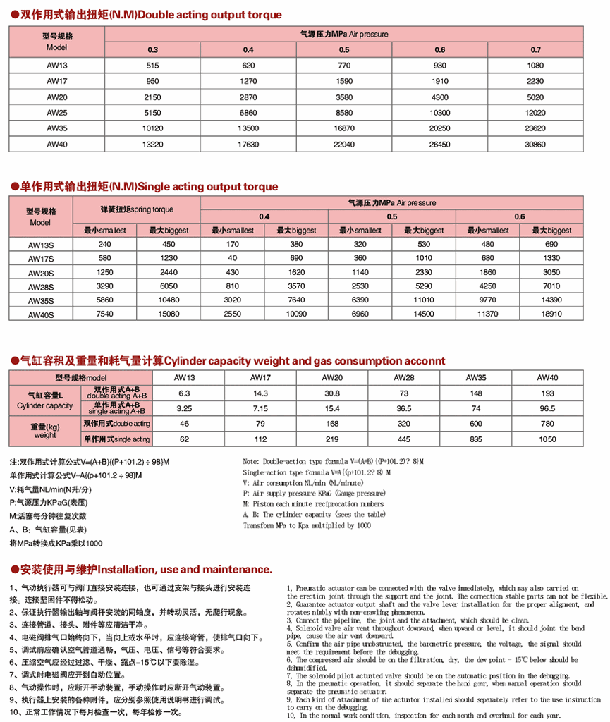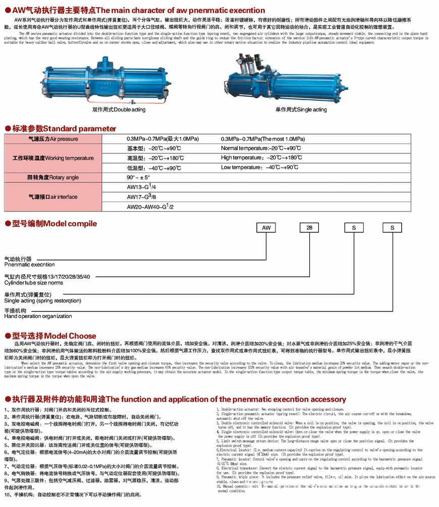 1.AW气动执行器分成双作用型和单作用型(弹簧复位),两个分体气缸,容易制造大型气缸。满足各种大型旋转阀的需要。