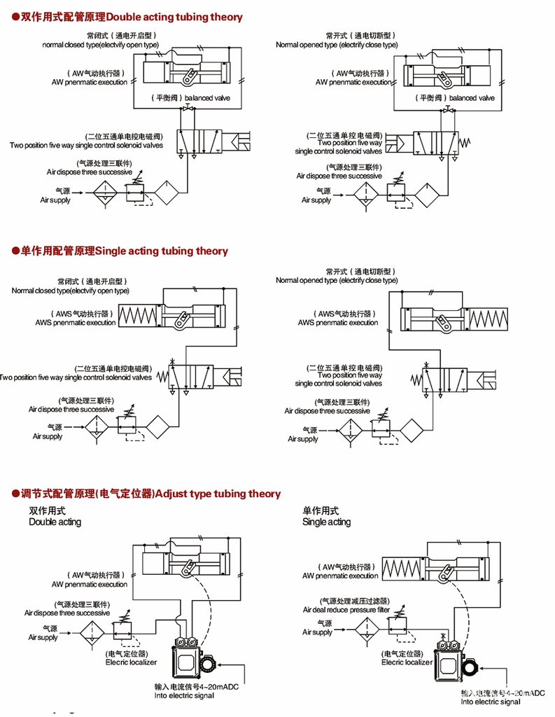 4.定位置器:①电气定位置器,②气动定位置器,③电流信号,④气压信号,⑤电气转换器,⑥防爆型5。气源处理三部分:①过滤减压阀,②润滑器。