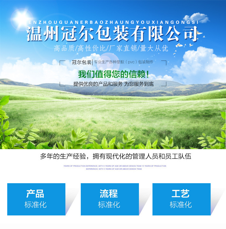 温州冠尔包装有限公司,公司成立于1991年,坐落“中国箱包生产基地”-温州钱库,是一家集设计,研发,生产,销售为一体的包装生产企业。我们坚称“优质,廉价,诚信”的主旨。以“团结一致,诚信,开拓,创新,务实,双赢”的理念。经过全体职工多年的不懈尽力和发展,我们现在保有大量国内外先进装置以及精湛的技术和管理人员。主要产品有PVCplasticbags,PVC手袋,拉链袋,按扣袋,吊钩袋,化妆品袋,服装袋,日用品袋,文件袋,礼品袋,PVC卡套,书套,PVC广告尺子,礼品尺子,笔记本和各种证书和文件PVC塑膜类制品。产品已销往欧美等数十个国家,受客户信赖,获得了客户的一致好评!