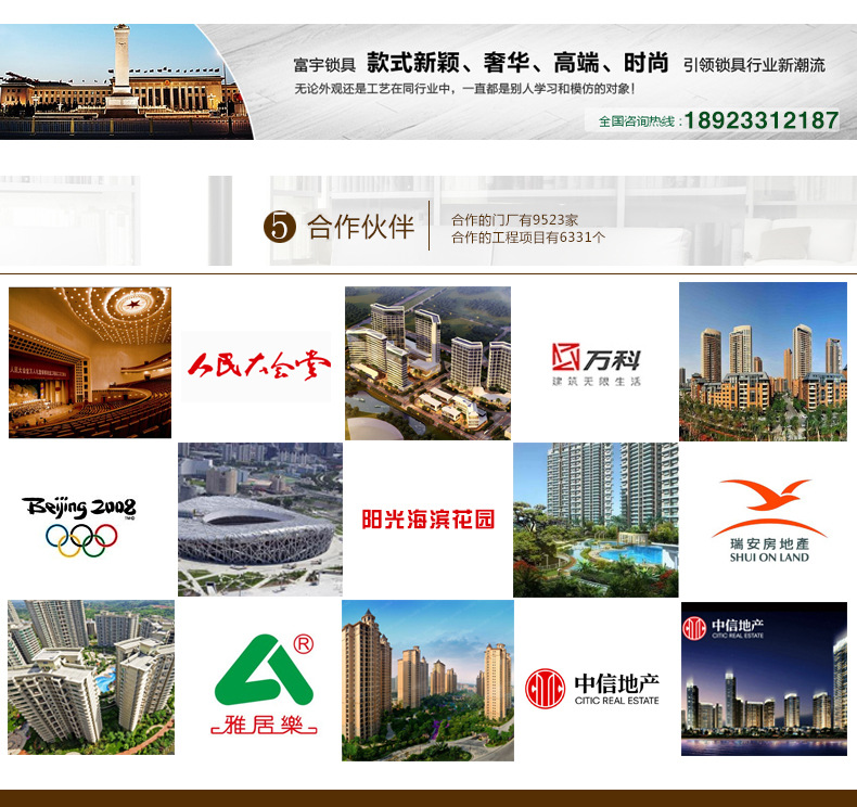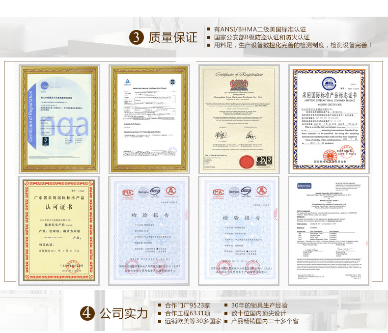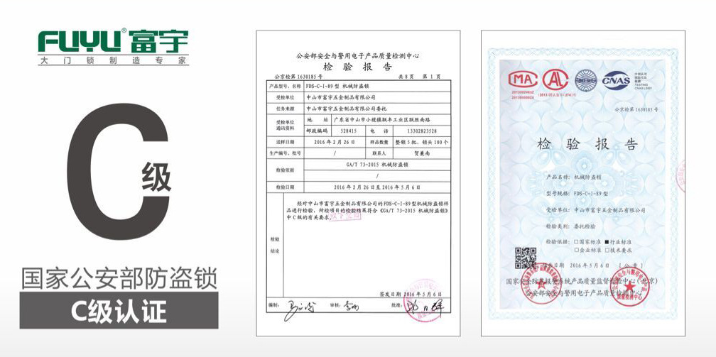 富宇公司管理体系是理想的,严苛按照ISO9001:2008国际质量体系展开质量管理,并奋斗改善产品的科学研究,开发,生产管理,质量控制和后续工作。销售服务系统。富宇锁芯已达到公安部的b和c标准,美国标准锁体已达到美国ANSI/BHMA级别,防盗锁已达到a,b和c合乎公安部的标准,指纹锁也达到了公安。部b级标准,并得到相关权威认证。