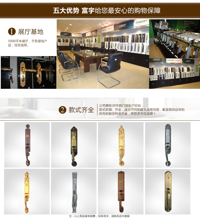 中山市富宇五金制品有限公司,成立于1999年,公司厂房占地面积20,000多平方米,专业生产大拉手锁,大套锁,别墅门锁,房舍门锁,不锈钢门锁,别墅门锁,世界防盗锁和防盗锁。锡纸开启执手锁,富丽堂皇推拉门锁等,具多年经验的高级工程师和专业技术人员,产品销往国内,并出口到欧美等30多个国家和地区。