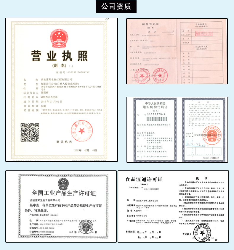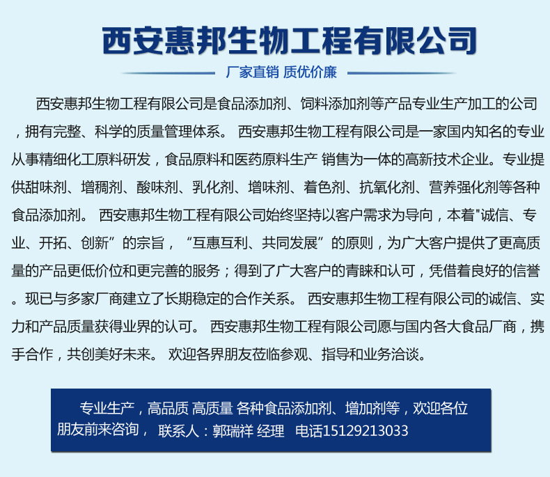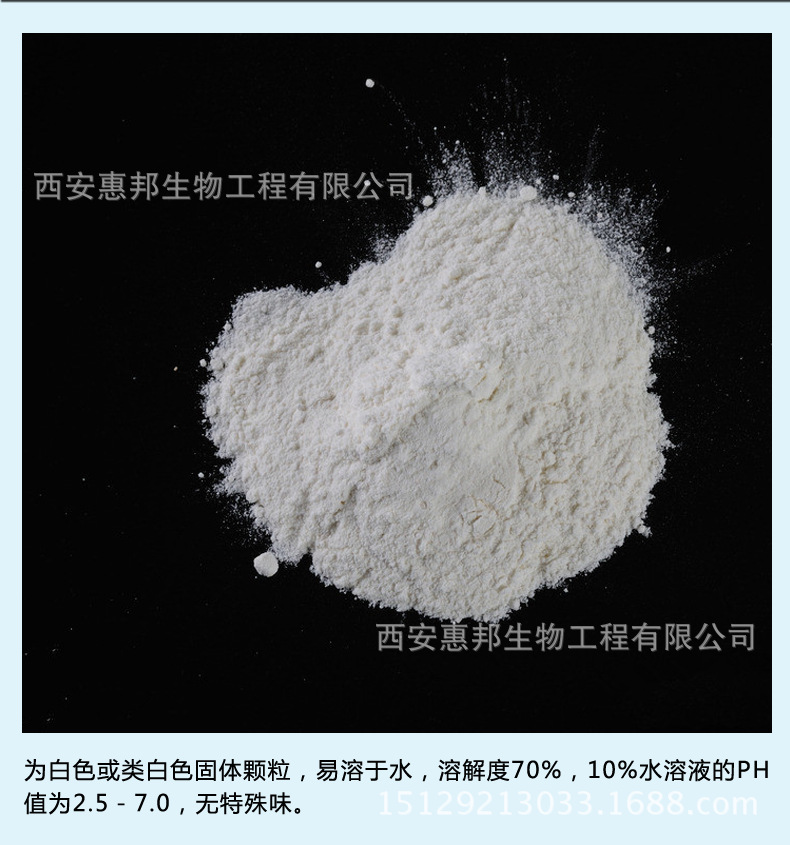 西安惠邦生物工程有限公司是一家专门从事食品添加剂,饲料添加剂和其他产品的生产和加工的公司,并享有完整,科学的质量管理体系。西安惠邦生物工程有限公司是一家国内出名的高科技企业,专门从事精巧化工原料的研究与开发,以及食品原料和医药原料的生产和销售。专业提供各种食品添加剂,例如甜味剂,增稠剂,酸味剂,乳化剂,增味剂,着色剂,抗氧化剂,营养增强剂等。西安惠邦生物工程有限公司一直坚称以客户需求为导向,基于本着“诚信,敬业,开辟,创新”的主旨,本着“互惠互利,联合发展”的规范,为广大客户提供更优质的产品,更低的价钱,更优质的服务。凭借不错的声誉始终受到广大客户的青睐和认可。与许多制造商确立了长期平稳的合作关系。西安惠邦生物工程有限公司的诚信,实力和产品质量已获得业界的认可。西安惠邦生物工程有限公司情愿与国内主要食品制造商携手协作,共创美好未来。欢迎各界朋友光临,指导和接洽业务。
