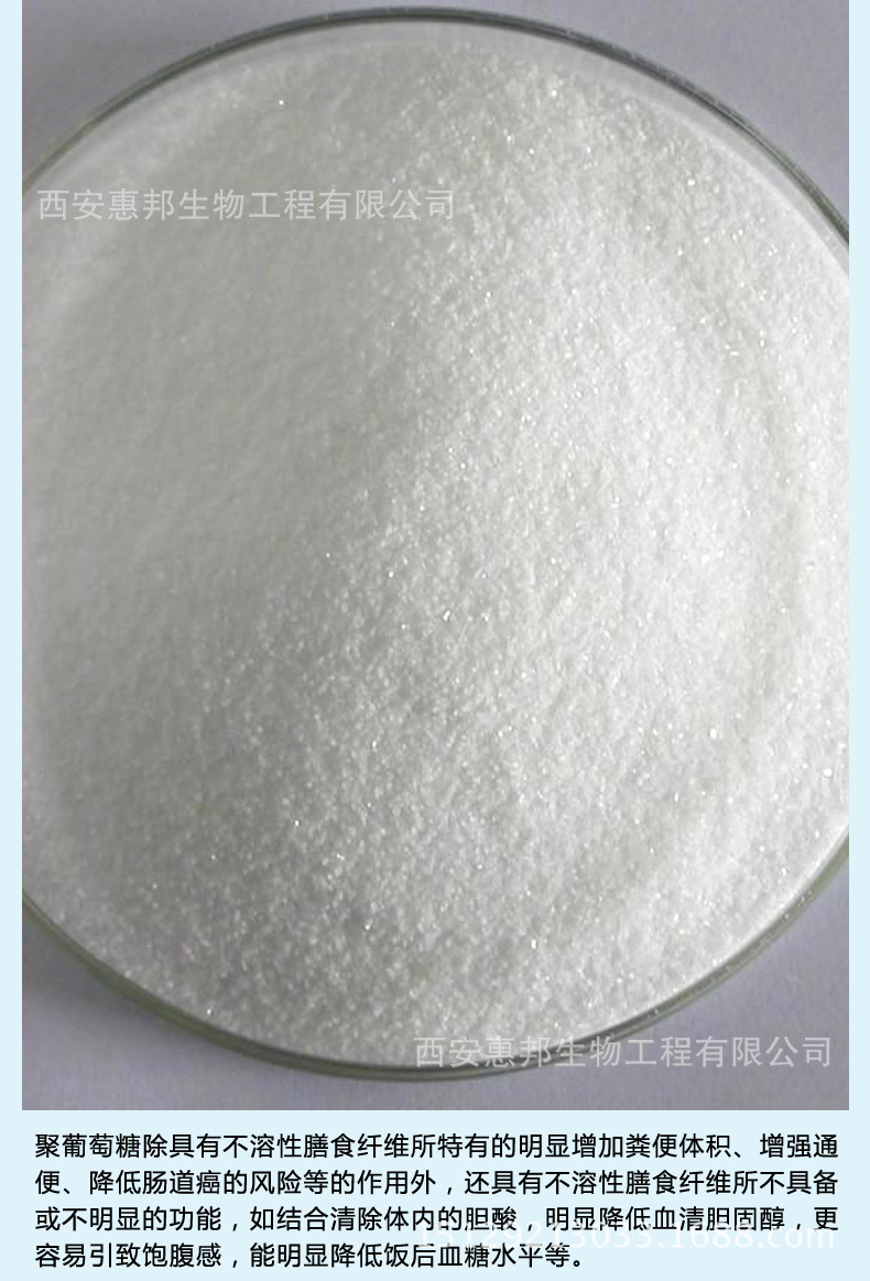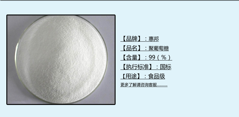 聚葡萄糖(polydextrose)是水溶性膳食纤维的别名,它是白色或几乎白色的固体微粒,易溶于水,溶解度为70%,PH值的10%水溶液为2.5-7.0,无它具有特别保健功能,是一种具有保健功能的食品成分,可补充人体水溶性膳食纤维的需求。该产品在日常生活中可单独与牛奶或水一齐服用。