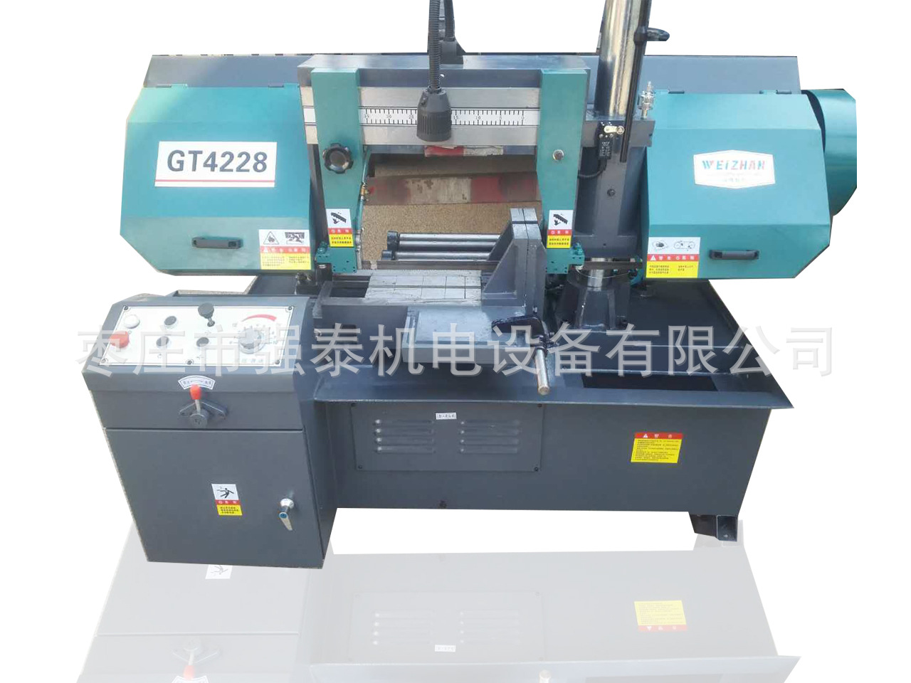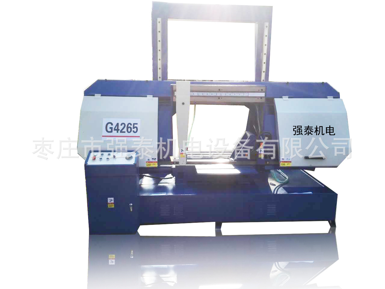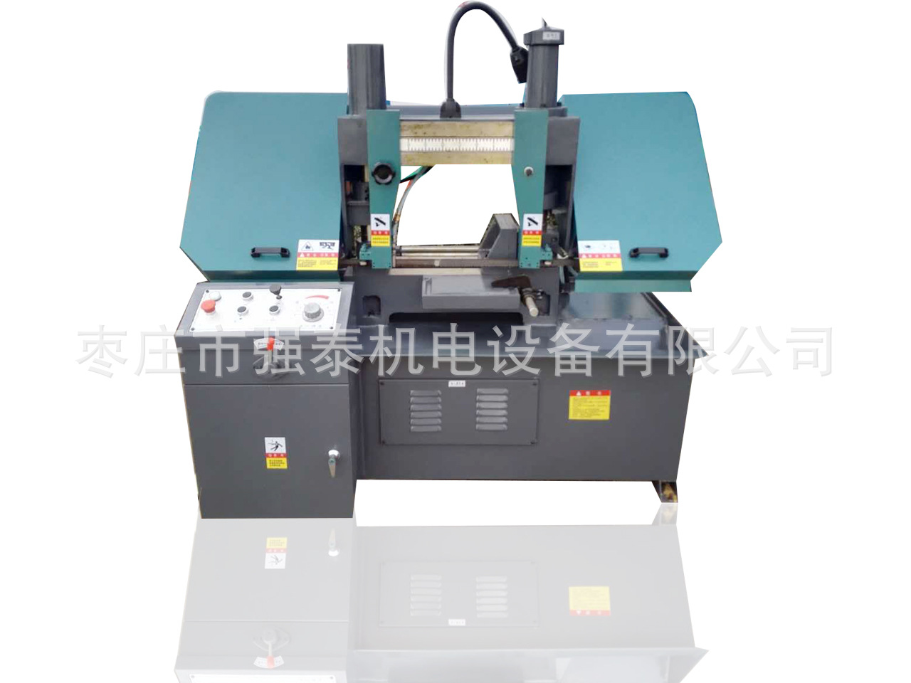 金属带锯床(英文名Metalband sawing machine,Metal band saw machine)主要用于锯切碳素结构钢,低合金钢,高合金刚,特别合金钢和不锈钢,耐酸钢等金属材质。带锯是一种锯切装置,用到金属锯片作为切割工具,用于切割金属材质。它主要用于黑色金属的方形材质。圆形材质和各种型材的切割也可用于切割有色金属和非金属材质。能耗小,物料浪费少,是一种高效节能的切割装置,具显着的节能和省料功效。双柱带锯机的主传动采用蜗轮箱变速,进给采用液压传动,铸件夹紧采用手动和液压混杂夹紧。具构造连贯,操作维护简便等特性。